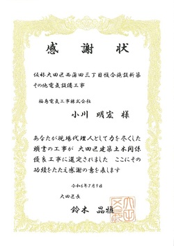 - 大田区より令和6年度・建設土木関係優良工事者として当社社員が表彰されました。
